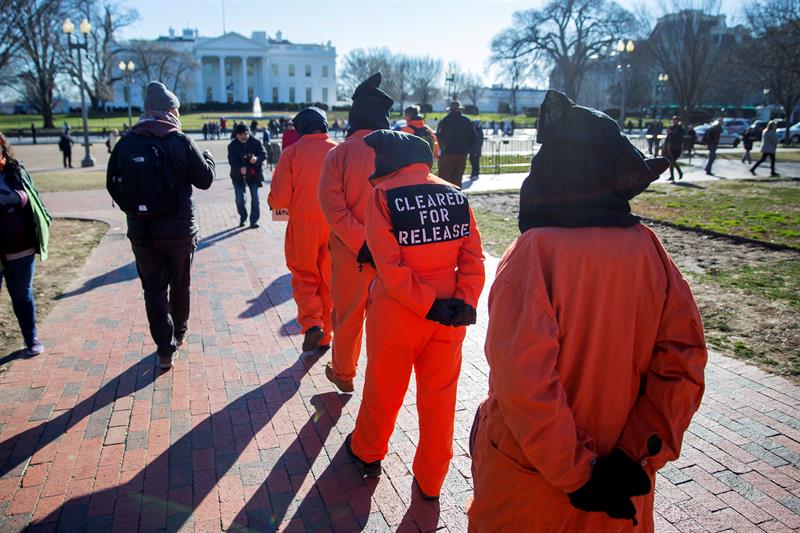 Un grupo de manifestantes se vistió con trajes color naranja, en la Plaza Lafayette, frente a la Casa Blanca, en Washington, DC, EE. UU., en reclamo por el cierre del centro de detención de los EE. UU. en la Base Naval de la Bahía de Guantánamo, Cuba.