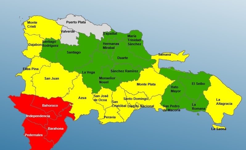 De esta forma, en alerta amarilla se sitúan los territorios de: San José de Ocoa, Samaná, Dajabón, Azua, Monte Plata, Elías Piña, Peravia, La Altagracia, San Juan, Montecristi, Santo Domingo, San Cristóbal y el Distrito Nacional.
