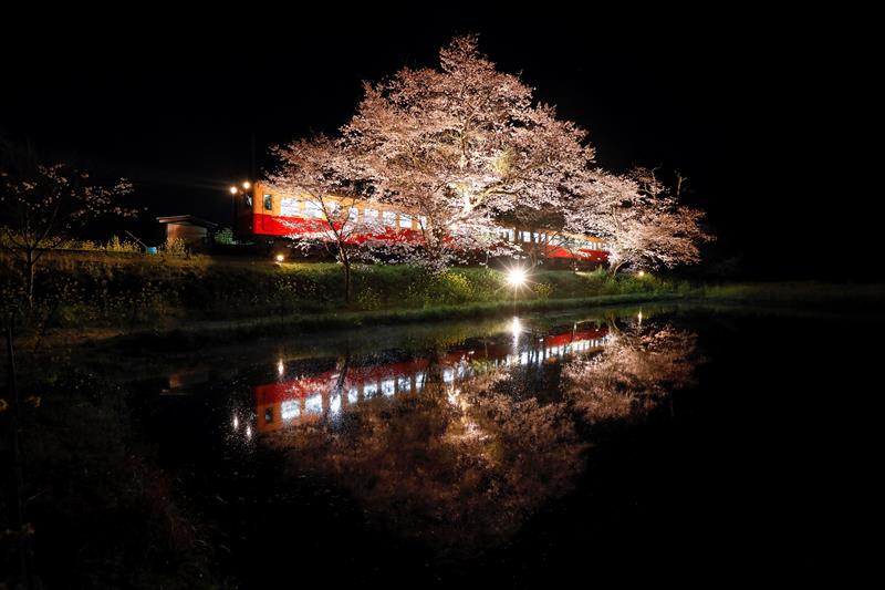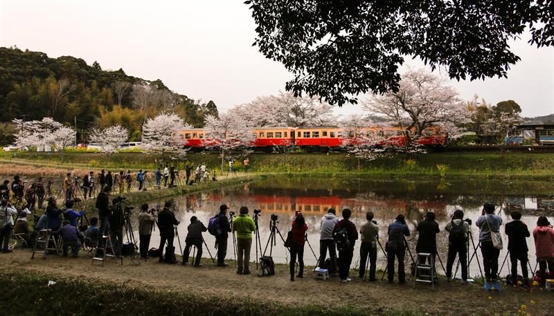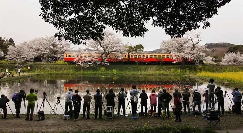 Vista de un tren de dos vagones en la línea ferroviaria local de Kominato con flores de cerezo en flor, que se reflejan en el agua de un arrozal, en una estación en Ichihara, Prefectura de Chiba, al este de Tokio, Japón, el 7 de abril 2019. Las flores de cerezo de Japón en plena floración atraen a los visitantes, ya que la temperatura en la ciudad aumentó a 20.7 grados centígrados, 3.3 grados más que lo normal.
