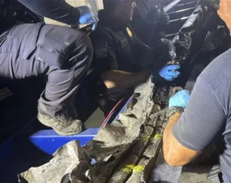 Al ampliar la verificación, los oficiales localizaron compartimentos alterados donde se escondía la droga, además de varias bolsas de lona camufladas entre la carga paletizada.