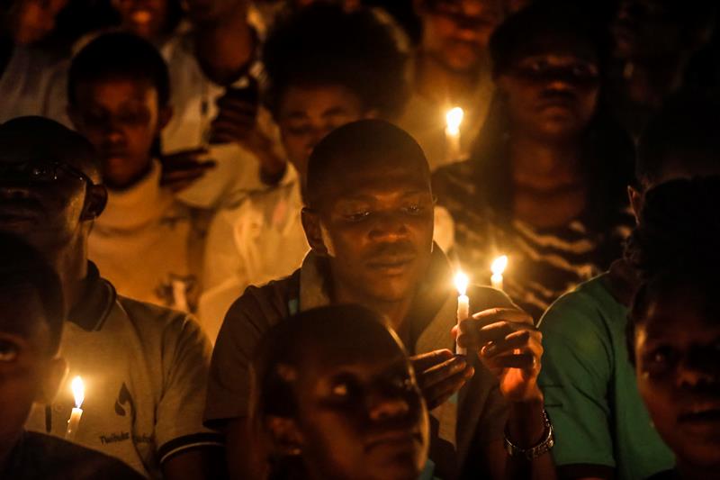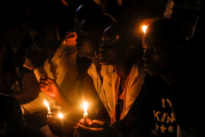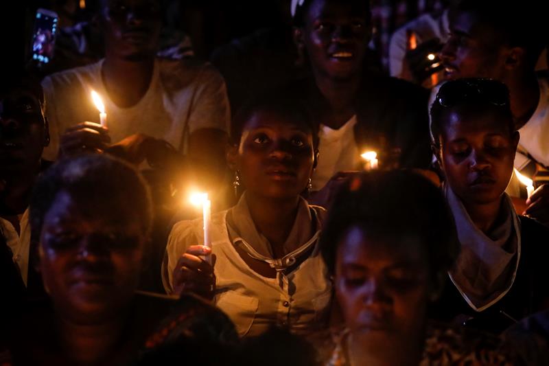 Cientos de personas sostienen velas durante una vigilia por aquellos que murieron en el genocidio de 1994, durante un evento de conmemoración en el estadio Amahoro en la capital Kigali, Ruanda, ayer domingo. Decenas de miles de ruandeses se reunieron en el estadio para conmemorar el 25 aniversario del genocidio del país en 1994, en el que extremistas de etnia hutu mataron a tutsis étnicos y hutus moderados durante una ola de asesinatos de tres meses que, según Ruanda, causaron la muerte de más de un millón de personas.