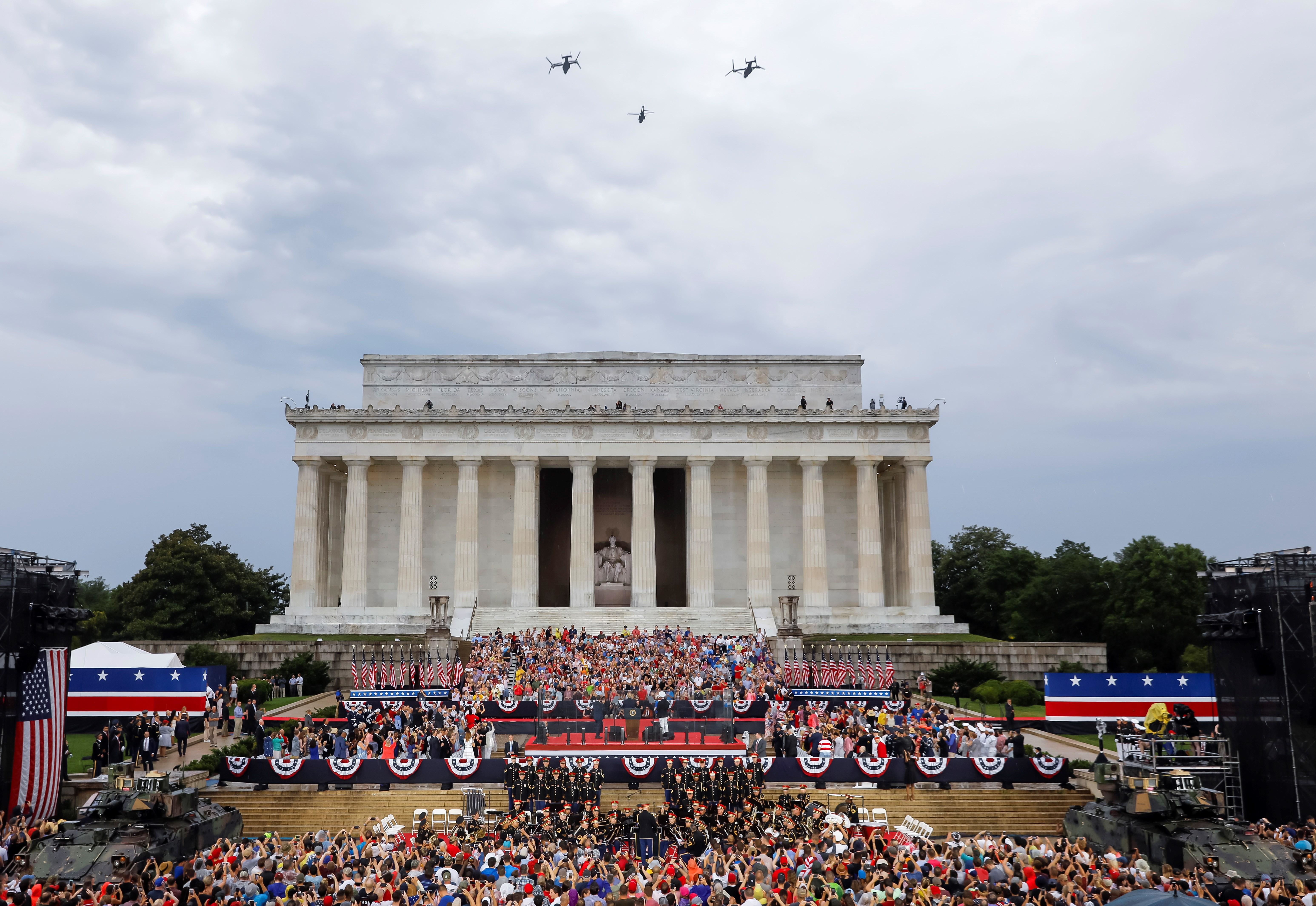Rodeado de tanques y con un discurso con pausas para presenciar el sobrevuelo de diferentes tipos de aviones militares, el presidente estadounidense, Donald Trump, presumió este jueves del potencial del Ejército de EE.UU. en la celebración del Día de la Independencia del país en Washington.