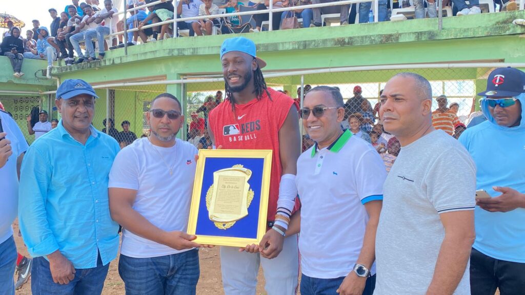 El pelotero dominicano de Grandes Ligas, Elly de la Cruz, fue reconocido por el director del Departamento Aeroportuario, Víctor Pichardo, y el diputado Jhon Contreras, durante la celebración de un torneo deportivo en esta provincia. El acto reunió a atletas, dirigentes y comunitarios, quienes celebraron la trayectoria del estelar jugador de los Cincinnati Reds.